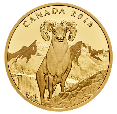 Le motif au revers, œuvre de Curtis Atwater, immortalise la majestueuse nature d'un emblème de la faune et de son spectaculaire habitat montagneux. La richesse de la gravure rend justice à la splendeur des cimes, des vallées boisées et des pentes rocailleuses qui caractérisent les Rocheuses canadiennes. Il n'en reste pas moins que le point central est la représentation d'un mouflon d'Amérique (Ovis canadensis) vu de face, qu'on identifie être un mâle par ses cornes distinctives, instantanément associées à cette espèce agile. Grâce à l'angle d'élévation, ces caractéristiques ajoutent à la stature déjà imposante de cette créature musclée, même au milieu d'un paysage aussi envoûtant. Sont également gravés au revers la mention « CANADA » et le millésime « 2018 ».