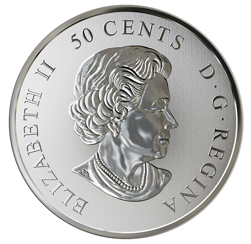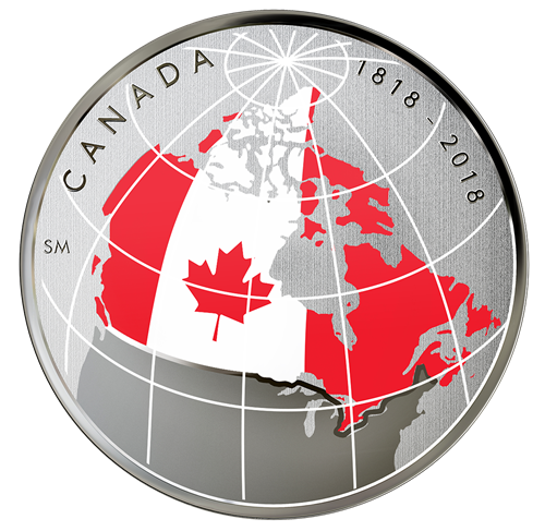 Le motif de la pièce de 50 cents exclusive, œuvre de Steve McPhee, met en vedette le drapeau blanc et rouge du Canada recouvrant le pays entier, disposé sur une carte muette. Une ligne gravée souligne la frontière internationale du 49e parallèle, dont nous célébrons le bicentenaire en 2018. Dans le noir, la pièce photoluminescente fait ressortir la carte du pays, ainsi que les lignes de longitude etde latitude. Au revers sont gravées la mention « CANADA » et les dates commémoratives « 1818‑2018 ». L'avers est à l'effigie de Sa Majesté la reine Elizabeth II, selon Susanna Blunt.