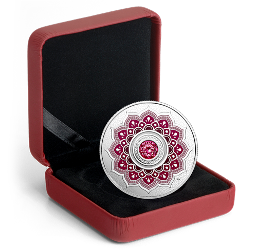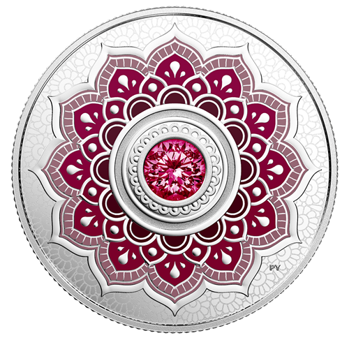 Au revers de cette pièce figure un mandala inspiré de l'art du henné, rehaussé d'une coloration sélective correspondant au cristal SwarvoskiMD associé au grenat, la pierre de naissance du mois froid de janvier. Brillant de tous ses feux, cette gemme d'un rouge flamboyant serait synonyme d'amitié, de constance et de loyauté. On dit aussi que le grenat apporte tranquillité, santé et protection durant les déplacements.