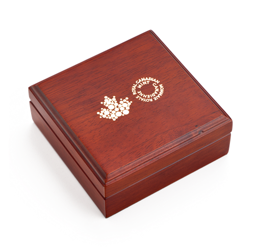 La pièce est encapsulée et présentée dans un boîtieren bois orné du logo de la Monnaie royale canadienne. Ce boîtier est assorti d'une boîte protectrice noire.