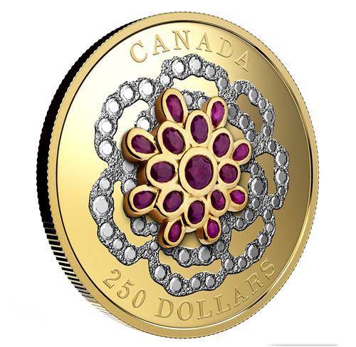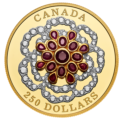 Les graveurs de la Monnaie royale canadienne ont recréé l'une des roses Tudor héraldiques qui se trouvent sur le diadème birman de la Reine. Le centre de la rose a été confectionné avec d'authentiques rubis, et un placage de platine sélectif a servi à définir les pétales qui l'entourent.