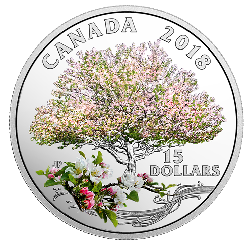 Le motif au revers, œuvre de l'artiste Jan Poynter, marie coloration réaliste et gravure minutieuse à l'effet brillant du fini épreuve numismatique pour recréer le spectacleéblouissant du printemps. Le pommier enpleine floraison est inspiré de la variété McIntosh, découverte pour la première fois à Dundela, en Ontario; il s'agit de la variété de pommes la plus cultivée au Canada de nos jours. À la manière d'une illustration botanique, labranche généreusement garnie au bas de la pièce offre une vue agrandie des fleurs délicates nichéesdans les feuilles vertes. L'ajout de volutes évoque le délicat parfum de l'arbre, qui se répand grâce à la brise printanière et attire les pollinisateurs vers le cœur jaunede chaque fleur rose ou blanche. L'avers est à l'effigie de Sa Majesté la reine Elizabeth II, selon Susanna Blunt.