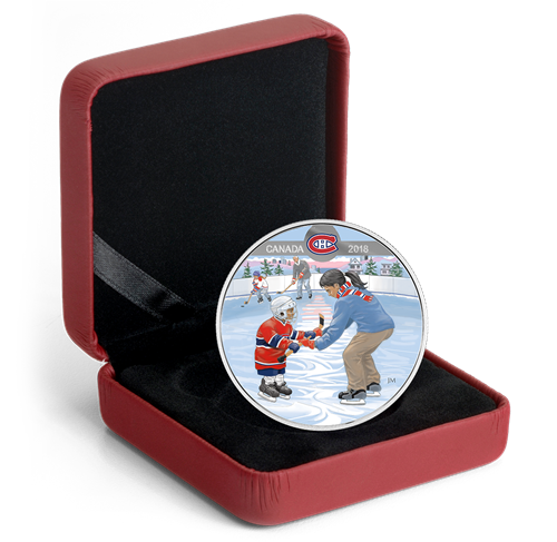 Célébrez le hockey canadien et les bons moments en famille. Le motif au revers, œuvre de l'artiste canadien John Mantha, représente un garçon qui apprend à patiner en s'agrippant à un bâton de hockey que sa mère tient fermement à l'horizontale. L'enfant porte fièrement un chandail des CanadiensMD de Montréal beaucoup trop grand pour lui. On peut presque sentir son pur contentement,et entendre le reste de la famille, en arrière-plan, qui l'invite à se mêler à la partie en cours.