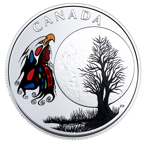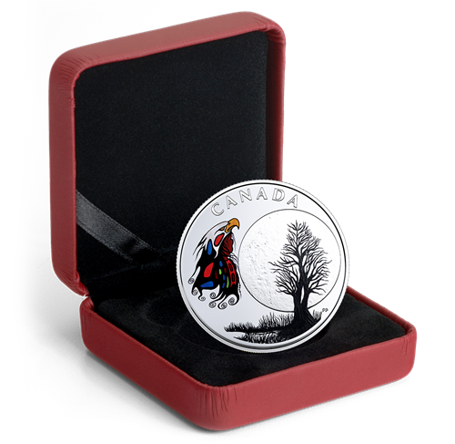 Les peuples autochtones du Canada considèrent chaque élément de la nature comme un membre vivant de la famille qui joue un rôle actif dans leur vie. Grand-mère Lune en est un bon exemple : omniprésente, elle se manifeste treize fois pendant l'année pour veiller sur lesenfants de mère Nature et éclairer leur chemin. Chaque lune offre un nouvel enseignement, et cette pièce représente la Lune de l'esprit, pendant laquelle onfait place à la sérénité tout en réfléchissant à notre place dans le monde. En cette occasion, nos pensées vont vers l'aigle, le messager qui transmet nos prières au Créateur : notre respect pour ce puissant oiseau croît de pair avec notre spiritualité. Ceux qui l'ont mérité peuvent porter une coiffe traditionnelle lorsqu'ils prient. Soyons reconnaissants chaque fois que l'aigle semanifeste, signifiant que notre appel a été entendu et que la guérison ne tardera pas.
