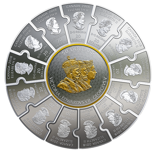 Cet ensemble de pièces casse-tête de 14 morceaux en argent pur à 99,99 % a unpoids métallique nominal de 502,47 grammeset fait 123,7 millimètres de diamètre, au total. Œuvre de l’artiste Tony Bianco, le motif de la pièce centrale présente une illustration plaquée or de l’édifice du Centre du Parlement du Canada, dont la construction fut achevée en 1866, dans ce qui s’appelait alors la province du Canada. Cet édifice est demeuré lesiège du gouvernement fédéral jusqu’en 1916, année où il fut détruit par un incendie qui ravagea tout sauf la Bibliothèque du Parlement. Autour de cette pièce se trouvent les 13 pièces en forme de morceaux de casse-tête sur lesquelles figurent des reproductions aux teintes sépia de photographies historiques de Bibliothèque et Archives Canada.Réunis, les morceaux forment un récit visuel de la première moitié de siècle du Canada comme pays autonome. À l’avers de la pièce centrale de 50 $ figurent les effigies plaquées d’or des trois monarques qui ont régné de 1866 à 1916 : la reine Victoria (selon Leonard C. Wyon), le roi Édouard VII (selon G. W. DeSaulles) et le roi George V (selon sir E. B. MacKennal). L’avers de chacune des pièces de 20 $ est à l’effigie de Sa Majesté la reine Elizabeth II, selon Susanna Blunt.