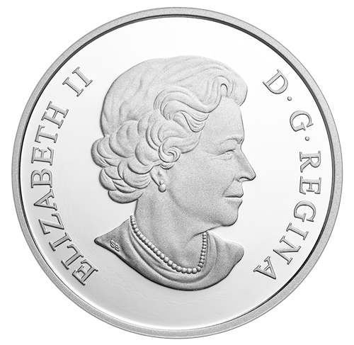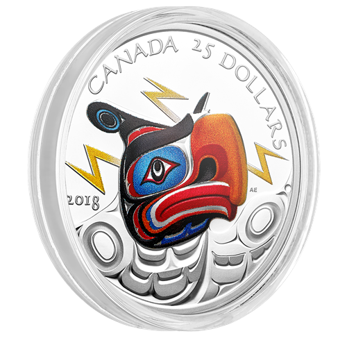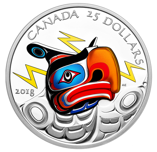 Œuvre de l’artiste de la côte du Nord-Ouest Andy Everson, le motif au revers de cette pièce met en vedette une créature mythologique légendaire, l’oiseau-tonnerre. La gravure à très haut relief évoque les profondes lignes de l’art traditionnel associé aux Kwakwaka’wakw et donne l’illusion que l’oiseau-tonnerre surgit de la pièce. On dit que chaque clignement des yeux de cette puissante créature surnaturelle provoque des éclairs, et chaque battement de ses ailes, de retentissants coups de tonnerre. Renvoyant au style expressif de cet art, l’application sélective de couleurs ajoute quant à elle à la narration visuelle en faisant ressortir les caractéristiques de la créature et en rehaussant l’intensité des éclairs. L’avers est à l’effigie de Sa Majesté la reine Elizabeth II, selon Susanna Blunt.