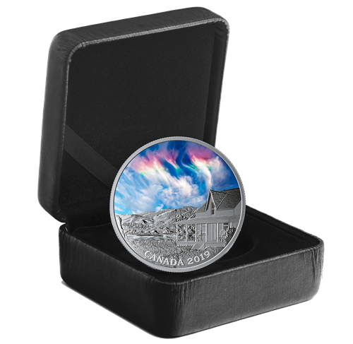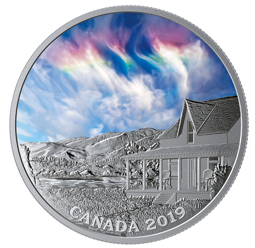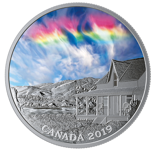 Si tout le monde est heureux de voir un arc-en-ciel après un orage, il existe au Canada un phénomène plusrare et plus emballant encore : un arc-en-ciel de feu, comme celui illustré sur cette pièce. Amplifié par la lumière noire, ce « nuage » multicolore se trouve sur la première des trois pièces technologiquement rehaussées qui mettentà la portée de tous d’inhabituels phénomènes célestes.