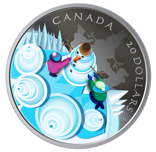 Œuvre de l’artiste canadien Steve Hepburn, le motif représente de façon contemporaine une scène hivernale classique. La vue en plongée offre une perspective ludique sur deux jeunes Canadiens profitant pleinement d’unjour d’hiver en faisant un bonhomme de neige. Les formes géométriques et le choix des couleurs contribuent à l’aspect résolument moderne du motif. La scène est aussi empreinte d’une certaine nostalgie, en particulier grâce aux cercles concentriques qui forment les quatre conifères : leurs spirales rappellent des sucettes! Rendant les ombres et la lumière vive à l’aide de couleurs froides et d’éléments gravés, ce motif, misant sur l’art de la superposition, déborde de légèreté et de joie de vivre, ce que reflète aussi l’ombre gravée sur la surface argentée de la pièce.