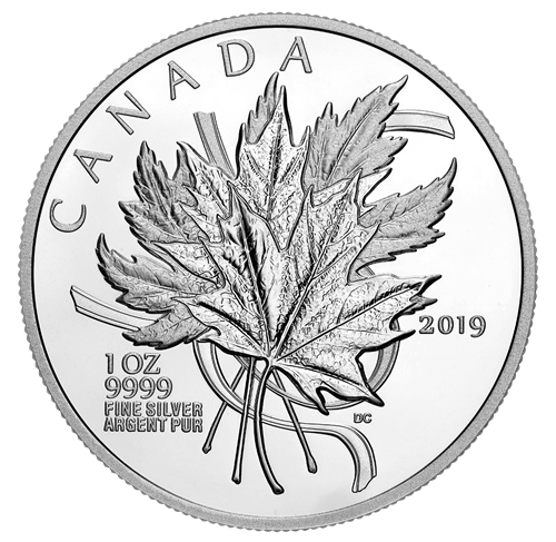 Le motif au revers, œuvre de l’artiste canadien David Caesar, présente un bouquet composé de deux feuilles de l’érable à sucre et de deux feuilles de l’érable argenté, retenu par un ruban négligemment noué. Les différentes techniques de givrage appliquées aux feuilles superposées ajoutent profondeur et texture au motif. L’avers est à l’effigie de Sa Majesté la reine Elizabeth II, selon Susanna Blunt.