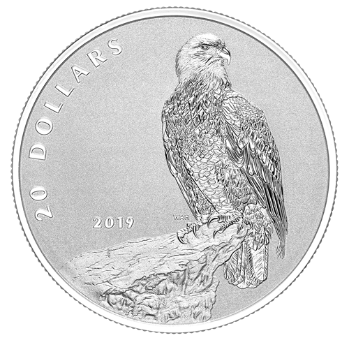 Le motif au revers de la pièce, œuvre de l’artiste canadien W. Allan Hancock, est une représentation traditionnelle du pygargue à tête blanche, Haliaeetus leucocephalus, et de la force incarnée qu’il évoque. Perché bien droit, le rapace fixe son regard d’acier sur un objet auloin, surveillant silencieusement les alentours depuis les hauteurs d’une saillie rocheuse. Le revers porte la valeur nominale « 20 DOLLARS » et le millésime « 2019 ». L’avers est à l’effigie de Sa Majesté la reine Elizabeth II, selon Susanna Blunt.