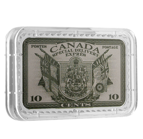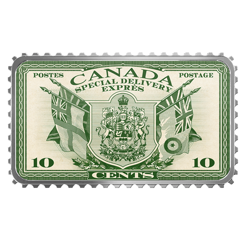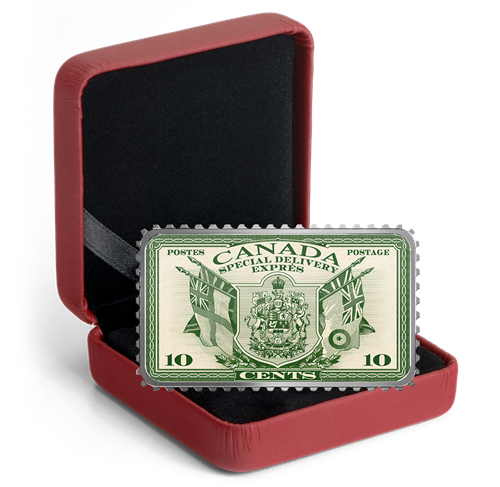 - MOTIF CLASSIQUE D'ANTAN! Cette pièce évoque le Canada des années de guerre par une reproduction d'un timbre exprès de 10 cents issu de la série de 1942-1943 consacrée à l'effort de guerre.