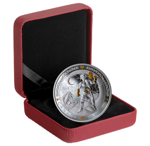 À l’ère des expéditions vikings en solcanadien (vers l’an 1000), l’impétueux Thor était l’une des figures les plus admirées du folklore et de la mythologie nordiques. C’est de lui que vient le motanglais désignant le jeudi, Thursday (« Thor’s Day », ou le jour de Thor). Sa force et son intrépidité sont mises en évidence sur la pièce, dans la représentation d’une bataille apocalyptique rehaussée d’un placage d’or sélectif.