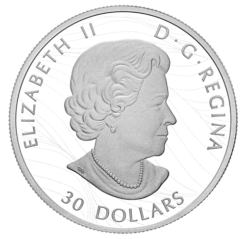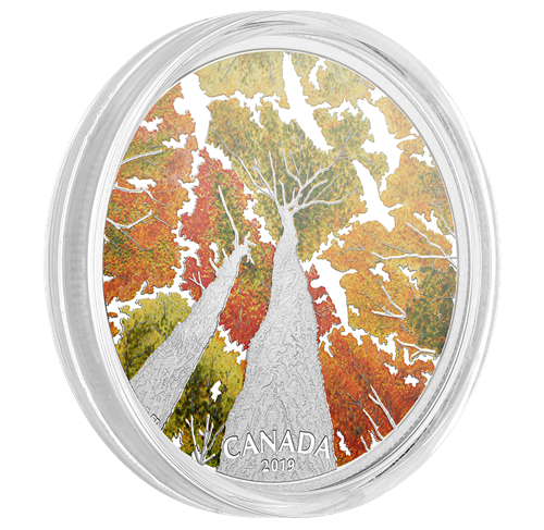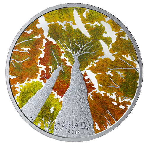 Œuvre de l’artiste Emily Damstra, le motif meten valeur la splendeur automnale d’une espèce classique d’érable indigène du Canada : l’érable à sucre (Acer saccharum). La vue en contre-plongée depuis le pied des arbres offre une perspective exceptionnelle sur les troncs et les branches gravés qui s’élèvent vers le soleil. Inspirées du phénomène naturel de la timidité des cimes, les ouvertures dans la canopée colorée des érables, rehaussées d’un fini épreuve numismatique, forment des silhouettes ressemblant à des bernaches du Canada (Branta canadensis) en plein vol. Sur le revers sont gravés la mention « CANADA » et le millésime « 2019 ». L’avers est à l’effigie de Sa Majesté la reine Elizabeth II, selon Susanna Blunt, et présente la valeur nominale « 30 DOLLARS ».