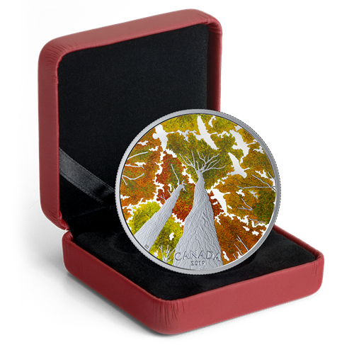 Voilà un signe indéniable de l’arrivée de l’automne : la période où un emblème canadien change de couleur tandis qu’unautre prend son envol. La deuxième pièce de la série Cimes feuillues de cette année vous invite à entrer dans une érablière, mais cette fois, pendant la saison la plus colorée du Canada.Un fini épreuve numismatique brille comme le soleilentre les cimes multicolores. Dans le feuillage, les interstices forment aussi un hommage : ils tracent la silhouette d’un symbole national connu pour sa migration automnale et pour les aurevoir qu’il cacarde – une raison de plus de lever la tête pour admirer le spectacle.