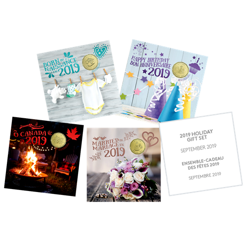 - Chaque ensemble comprend des pièces hors-circulation** de 2 $, 25 ¢, 10 ¢ et 5 ¢, millésimées 2019.