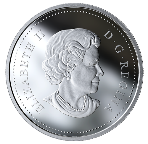 Rehaussé d’une coloration sélective de manière à ressembler à une photographie en noir et blanc,le motif de la pièce, œuvre de Tony Bianco, nous ramène au matin du 6 juin 1944, quand la première vague de soldats canadiens selance à l’assaut de Juno Beach. Tout comme le logo de l’anniversaire du jour J de l’Association Centre JunoBeach, la scène s’inspire d’un moment filmé lors du débarquement du Régiment North Shore du Nouveau-Brunswick sur le secteur Nan Red de la plage (La Rive Plage). Un soldat d’infanterie a les traits tendus après avoir jeté un coup d’œil sur ce qui l’attend – ce sera son tout premier combat. Puis, un moment touchant, une main rassurante se pose sur son épaule, dénotant humanité et solidarité au milieu des tirs ennemis et de l’ambiance de peur; le jonc de mariage doré sur cette main nous rappelle le coût de la guerre et les proches laissés derrière. Dans le ciel, la lettre « V » (pour « Victoire ») est représentée en code morse par une séquence de points et detraits qui évoque les bulletins radio ayant annoncéle débarquement des Alliés ce jour-là. Le revers porte aussi la mention « CANADA », les années « 1944 » et « 2019 », et la valeur nominale « DOLLAR ». L’avers est à l’effigie de Sa Majesté la reine Elizabeth II, selon Susanna Blunt.