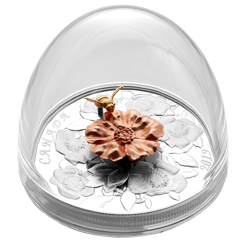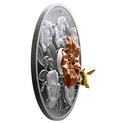 Sur cette pièce de collection de 5 oz en argent pur à 99,99 %,un bourdon mobile vole autour de l'une des fleurs les plus spectaculaires del'histoire de la Monnaie. En inclinant la pièce, on fait bouger l'insecte plaqué d'or autour des pétales d'une rose sauvage rehaussés d'un placage d'or rose. Le rosier fait partie desnombreuses plantes à fleurs du Canada dont la survie dépend de l'extraordinaire petit pollinisateur.