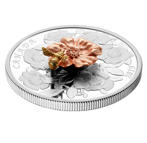 Le motif de la pièce, œuvre de l'artiste Tony Bianco, présente un gros plan de la rose sauvage la plus répandue au Canada, Rosa acicularis,l'emblème floral de l'Alberta.Les feuilles et les fleurs de cet arbuste indigène couvrent la majeure partie du revers gravé, dont le fini épreuve numismatique est aussi lumineux qu'un jour d'été sans nuage. L'image est surmontée par deux éléments moulus dans l'argent sterling : une fleur plaquée d'or rose etun bourdon plaqué d'or. Fermement fixée à la surface de la pièce, la fleur aux cinq pétales est entièrement ouverte, exposant ses anthères pleines de pollen, cette ressource alimentaire pour les insectes pollinisateurs. Enfin,le bourdon mobile ajoute une touche interactive à ce motif multidimensionnel. Mû par la gravité, le bourdon « vole » autour de la rose dès que la pièce est inclinée d'un côté ou de l'autre. Sur le revers sont gravés la mention « CANADA » et le millésime « 2019 ». L'avers est à l'effigie de Sa Majesté la reine Elizabeth II, selon Susanna Blunt.