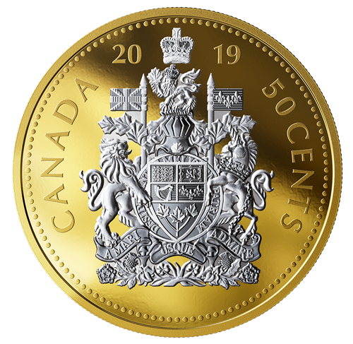 Le motif au revers représente les armoiries du Canada. L'écucentral est supporté par un lion tenant le drapeau de l'Union royale (Union Jack), à gauche, et une licorne tenant un drapeau orné de trois fleurs de lys françaises, à droite. Il est divisé en cinq sections portant les emblèmes historiques de l'Angleterre, de la France, de l'Écosse et de l'Irlande, ainsi qu'un rameau de trois feuilles d'érable. Il est encerclé d'un ruban portant la devise de l'Ordre du Canada : Desiderantes meliorem patriam (Ils aspirent à une patrie meilleure). L'écu est surmonté d'un heaume royal entouré de lambrequins de feuilles d'érable, dont le cimier est un léopard couronné tenant une feuille d'érable. Au-dessus du léopard, qui symbolise la souveraineté du Canada, est placée la couronne de saint Édouard, qui représente la monarchie constitutionnelle du pays. À la base de l'écu sont déployées une banderole portant la devise A mari usque ad mare (D'un océan à l'autre) ainsi qu'une guirlande composée des emblèmes floraux de l'Angleterre, de l'Écosse, de la France et de l'Irlande. Le champ est rehaussé d'un placage d'or inverse, et la surface en argent de la pièce attire le regard sur le relief gravé au centre, entouré du mot « CANADA », du millésime « 2019 » et de la valeur nominale « 50 CENTS ». L'avers, lui aussi rehaussé d'un placage d'or inverse, est à l'effigie de Sa Majesté la reine Elizabeth II, selon Susanna Blunt.
