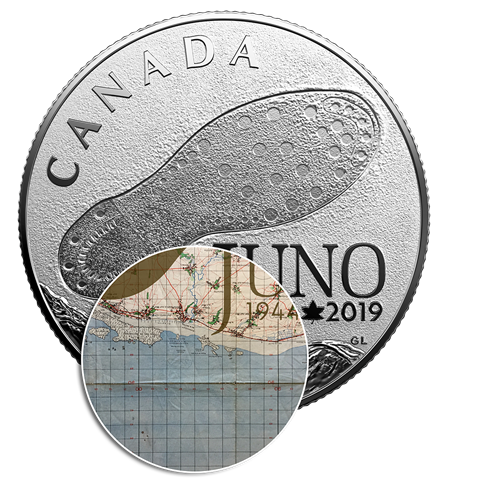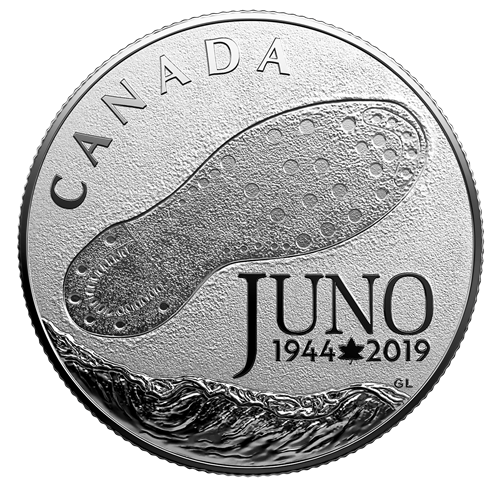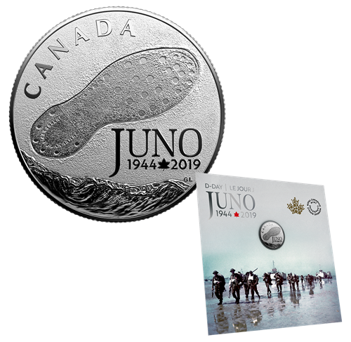 - SUPERBEMENT FRAPPÉE DANS L'ARGENT FIN. Cette pièce commémorant le jour J rappelle l'instant précis où les soldats canadiens ont posé le pied sur la plage de Juno Beach le matin du 6 juin 1944.