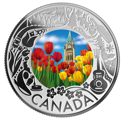 Œuvre de l’artiste canadien Steve Hepburn,la pièce représente des feux d’artifice, en pleine nuit de janvier, surplombant une illustration en biais de la chute du Fer à cheval de Niagara Falls, en Ontario, toute illuminée de couleurs. L’image est encerclée d’emblèmes stylisés qui représentent de populaires attractions et activités extérieures du Canada : lumières d'iver aux chutes Niagara, arbre de Noël, rodéo, dégustation de vin, randonnée en traîneau à chiens, musique folk, cerisiers en fleurs, dégustation de sirop d’érable, observation de baleines, tulipes, balade côtière et aurore boréale. L’avers est à l’effigie de Sa Majesté la reine Elizabeth II, selon Susanna Blunt, et présente la valeur nominale « 3 DOLLARS »ainsi que le millésime « 2019 ».