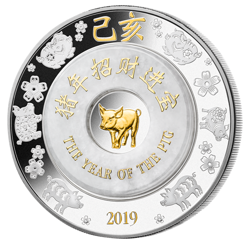 Pièce de 2 oz en argent pur – Année du Cochon – Pièce avec ornement en jade et placage d’or sélectif