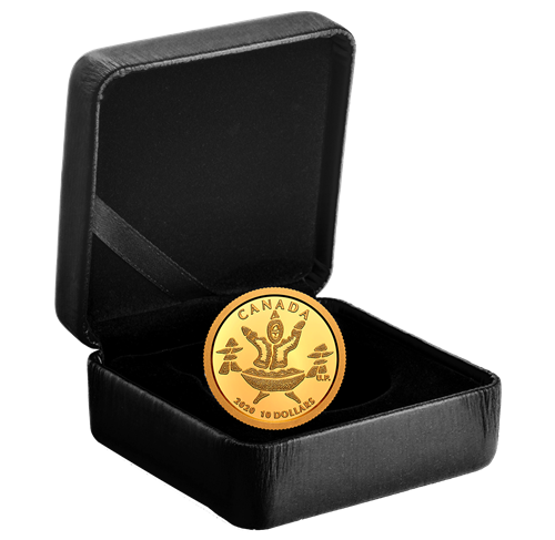 Découvrez le tout dernier ajout à notre gamme de pièces de collection en or : une pièce de 1/20 oz en or pur qui marie parfaitement art et élégance, et ce, à un prix fort intéressant! Le qulliq qui figure sur cette pièceévoque une lueur d'espoir qui illumine la nuitnoire et réchauffe l'esprit, le corps et l'âme. Tout comme les inuksuitqui guident notre chemin, la lampe à l'huile traditionnelle est un important symbole de la culture inuite : elle représente un foyer au cœur de l'Arctique, où elle incarne l'énergie et les soins fournis par les femmes qui en entretiennent la flamme.