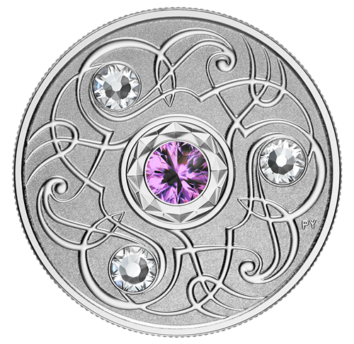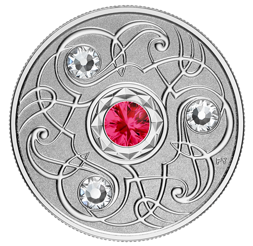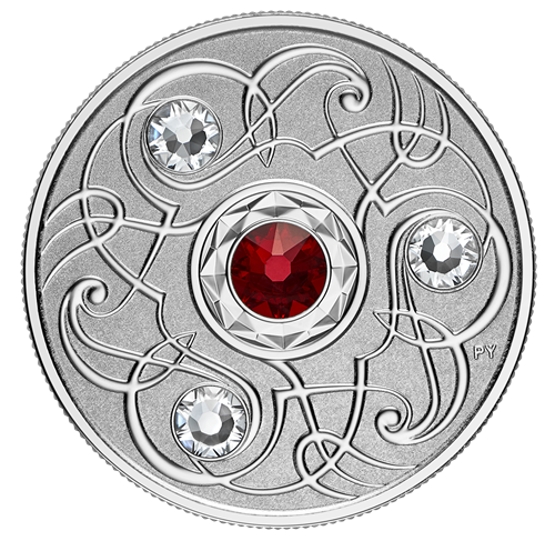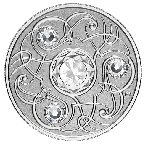 Le motif au revers de chaque pièce, œuvre de l’artiste Pandora Young, est à la croisée de l’art et des mathématiques. On y retrouve unmotif répétitif stylisé, disposé selon les lois du système sénaire. L’œuvre gravée, inspirée de la triskèle celtique, incorpore trois cristaux SwarovskiMD et représente la pierre de naissance de chaque mois grâce à un quatrième cristal SwarovskiMD incrusté au centre. L’avers est à l’effigie de Sa Majesté la reine Elizabeth II, selon Susanna Blunt.