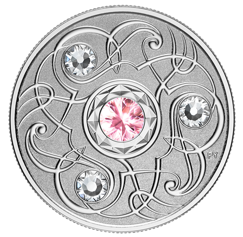 Le motif au revers, œuvre de l'artiste Pandora Young, est à la croisée de l'art et des mathématiques. On y retrouve un motif répétitifstylisé, disposé selon les lois du système sénaire. L'œuvre gravée, inspirée de la triskèle celtique, incorpore trois cristaux SwarovskiMD incolores et célèbrela pierre de naissance du mois d'octobre (la tourmaline) par un quatrième cristal SwarovskiMD incrusté au centre. L'avers est à l'effigie de Sa Majesté la reine Elizabeth II,selon Susanna Blunt.