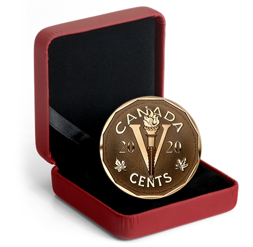 La pièce reproduit le célèbre motif de la Victoire, œuvre de Thomas Shingles, qui a figuré sur la pièce canadienne de 5 cents de 1943 à 1945. Un flambeau allumé représente les sacrifices qu’a faits la population canadienne pendant la Seconde Guerre mondiale, au pays comme sur les champs de bataille. On aperçoit en arrière-plan un grand V à la signification double : il renvoie à la fois au célèbre signe de la Victoire de sir Winston Churchill et à la valeur nominale en chiffres romains. Des feuilles d’érable entourent le V, et les denticules habituels sont remplacés par une version bilingue du message d’origine en code morse : « WE WIN WHEN WE WORK WILLINGLY LA BONNE VOLONTÉ EST GAGE DE VICTOIRE ». L’avers est à l’effigie du roi George VI selon T. H. Paget.