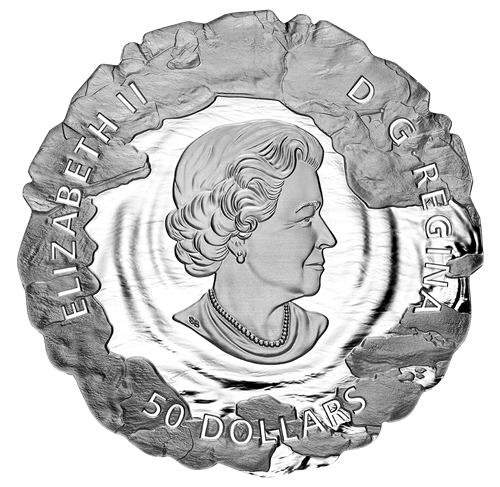 L'histoire de l'expédition Franklin est reconstituée sur cette pièce de 5 oz en argent fin, dont la tranche évoque la surface inégale de la glace.