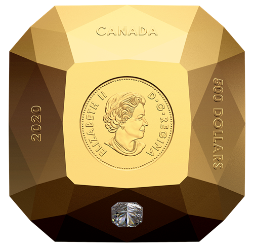 La forme de la pièce et ses multiples facettes correspondent en tous points au diamant Forevermark Black Label carré. L'une des facettes de la couronne est rehaussée d'un diamant Forevermark Black Label carré de 0,2 carat, qui sert de modèle à la pièce – et qui est l'un des derniers à avoir été extraits de la mine Victor dans le Nord de l'Ontario. Le millésime « 2020 », l'inscription « CANADA » et la valeur nominale « 500 DOLLARS » figurent sur les autres facettes de la couronne, encadrant la table où est gravé l'avers, à l'effigie de Sa Majesté la reine Elizabeth II, selon Susanna Blunt.