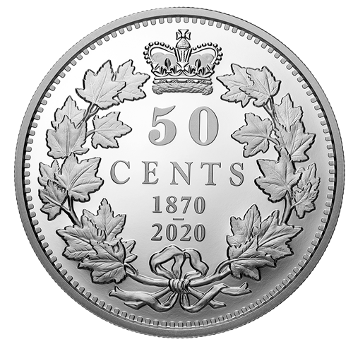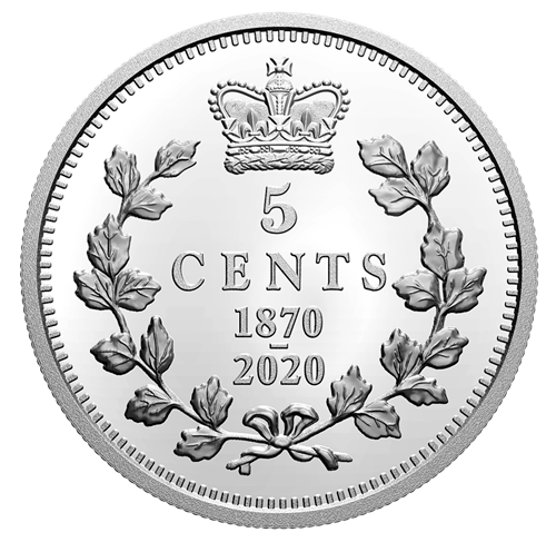 Les quatre pièces portent une inscription à double date (« 1870-2020 ») soulignant le 150eanniversaire des premières pièces nationales du Canada. Au revers de chacune figure le motif de rameauxd’érable croisés et surmontés de la couronne de saint Édouard, œuvre de Leonard C. Wyon, qui ornait lespièces des quatre valeurs nominales (5, 10, 25 et 50 cents) émises en 1870 par le Dominion du Canada. Les pièces de 5 cents et de 10 cents présentent à l’avers l’effigie « laurée » de la reine Victoria, selon Leonard C. Wyon. Les pièces de 25 cents et de 50 cents présentent quant à elles l’effigie « à diadème » de la reine Victoria, selon Leonard C. Wyon.