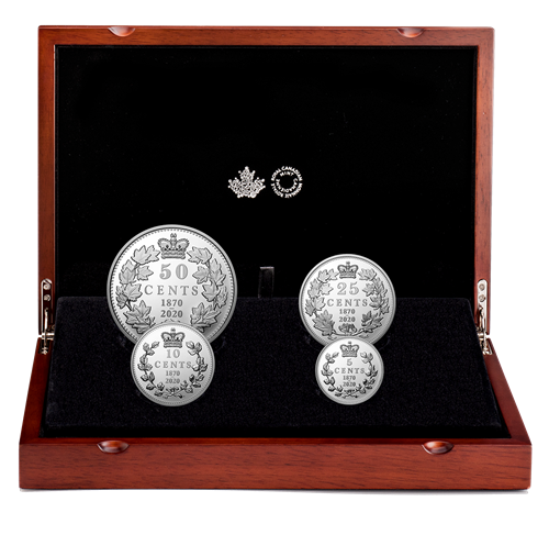 Les premières pièces nationales du Canada, émises en 1870, ont 150 ans cette année. Cet ensemble édition limitée est un beau clin d'œil aux quatre pièces (5, 10, 25 et 50 cents) de l'époque. Frappéedans de l’argent pur à 99,99 % et faisant deux foisla taille de l’originale, chacune est un hommage moderne au passé, à un graveur légendaire et aux rameaux d’érable qui donnaient au motif son caractère distinctement canadien.