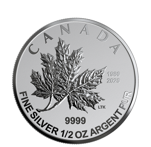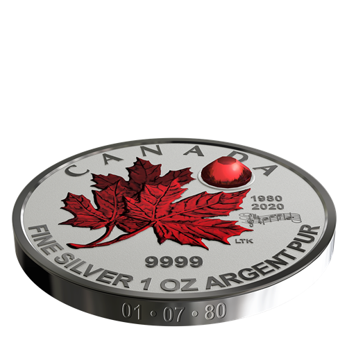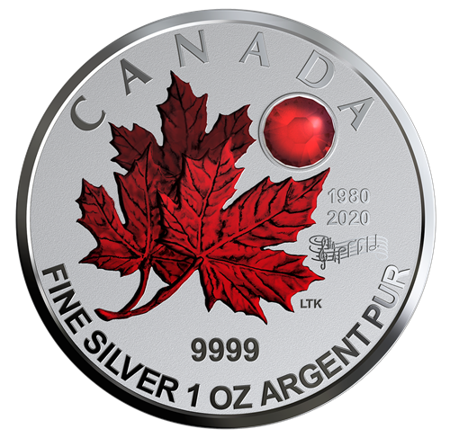 Chacune des cinq pièces porte le même motif à feuilles d’érable au revers, œuvrede Lisa Thomson Khan. La double date « 1980 2020 » souligne le 40e anniversaire de la Loi sur l’hymne national, qui a fait de l’Ô Canada l’hymne officiel de notrepays. Sur la pièce de 1 oz, le bouquet de trois feuilles d’érable est teinté d’un rouge métallique qui laisse entrevoir l’éclat de l’alliage d’argent. Mais cette grande pièce se distingue également par trois autres caractéristiques : un élément Swarovskiᴹᴰ rouge, la date de laproclamation officielle sur la tranche (« 01.07.80 »), et une portée gravée reproduisant les premières notes de l’Ô Canada.