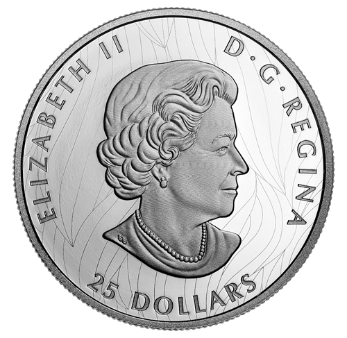 Œuvre de l'artiste canadien Neil Hamelin, le motif au revers présente le noble pygargue à tête blanche, vu de trois quarts, qui dirige son regard perçant et son bec crochu distinctifs vers lechamp de la pièce à sa droite. Les plumes de l'impressionnant rapace semblent ébouriffées, leur forme et texture étant grandement accentuées par le relief exceptionnellement haut de la pièce, ce qui confère une profondeur inégalée au motif. Cet effet saisissant est amplifié par le fini épreuve numismatique, qui donne à la gravure et à son remarquable relief une toile de fond miroitante parfaitement lisse. L'avers est à l'effigie de Sa Majesté la reine Elizabeth II, selon Susanna Blunt.