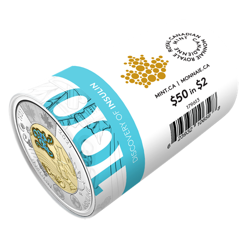 Chaque rouleau spécial contient 25 exemplaires de la pièce de circulation de 2 $ 2021 – Découverte de l’insuline, présentés dans un rouleau au papier d’emballage spécial assorti au motif gravé sur la pièce.