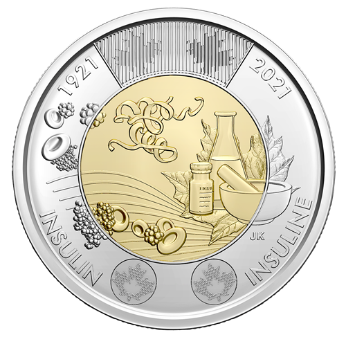 Le motif au revers de la pièce de 2 $, œuvre de l’artiste canadien Jesse Koreck, présente une double date (« 1921 2021 ») qui souligne le 100e anniversaire d’une innovation médicale canadienne. La découverte de l’insuline, faite à l’Université de Toronto, est représentée par une feuille d’érable et des symboles traditionnels : unancien flacon d’insuline, un erlenmeyer, un mortier et un pilon. Sur le disque central, onvoit de l’insuline sous forme monomère, rehaussée de touches de bleu sur la version avec coloration sélective de la pièce, tandis que la représentation de l’hormone à l’œuvre dans le sang s’étend sur l’anneau extérieur. L’avers est à l’effigie de Sa Majesté la reine Elizabeth II, selon Susanna Blunt.