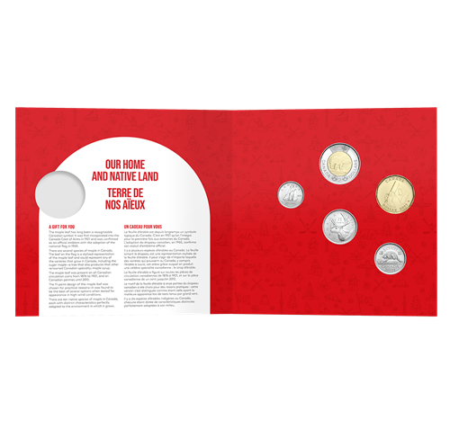 - Terre de nos aïeux. Sur le thème de l'Ô Canada, l'ensemble comprend* des versions hors-circulation de pièces canadiennes émises en 2021 (2 $, 1 $, 25 ¢, 10 ¢ et 5 ¢), une autre belle façon de souligner l'année.