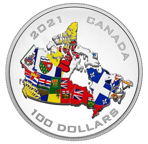 Au revers de la pièce figure une reproduction de la carte du Canada où sont amalgamés les drapeaux provinciaux et territoriaux de la nation. Chaque drapeau remplit la forme du territoire ou de la province qu’il représente : au nord, le Yukon, les Territoires du Nord-Ouest et le Nunavut; d’ouest en est, la Colombie-Britannique, l’Alberta, la Saskatchewan, le Manitoba, l’Ontario, le Québec, le Nouveau-Brunswick, l’Île-du-Prince-Édouard, la Nouvelle-Écosse et Terre-Neuve-et-Labrador. Sont aussi gravés au revers l’année « 2021 », le mot « CANADA » et la valeur nominale « 100 DOLLARS ». L’avers est à l’effigie de Sa Majesté la reine Elizabeth II, selon Susanna Blunt.