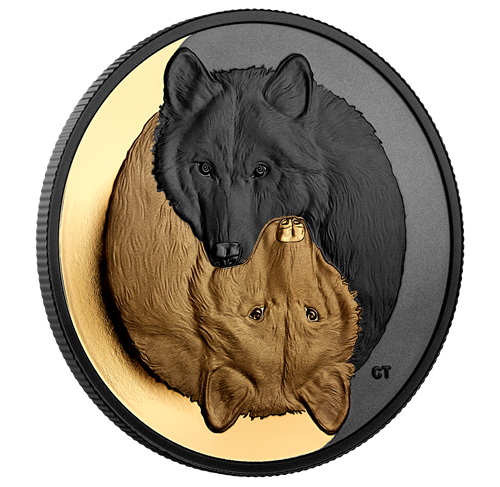 Le motif circulaire au revers, œuvre de Claude Thivierge, consiste en un symbole contrastant de yin et de yang qui représente le loup gris (Canis lupus). L’étreinte desdeux bêtes illustre les liens sociaux étroits qui unissent les membres de la meute. Chacun des loups a le regard fixé en avant. Un placage d’or et de rhodium noir scinde parfaitement l’image gravée en deux moitiés opposées mais complémentaires. À l’avers, l’effigie de Sa Majesté la reine Elizabeth II, selon Susanna Blunt, est aussi rehaussée d’un placage d’or.