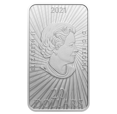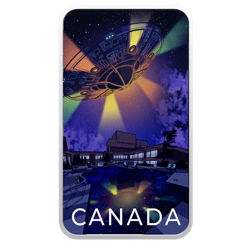 Tout comme la pièce de 2019 mettant en scène l’incident de Shag Harbour, cette pièce rectangulaire de 1 oz en argent pur à 99,99 % présente une orientation verticale qui accentue la hauteur. Elle montre l’ovni flottant au-dessus de la piscine située sur le toit de l’hôtel de 17 étages, haut dans le ciel du centre-ville animé de Montréal.