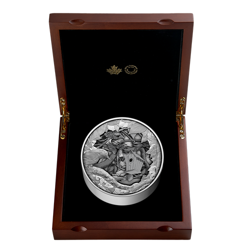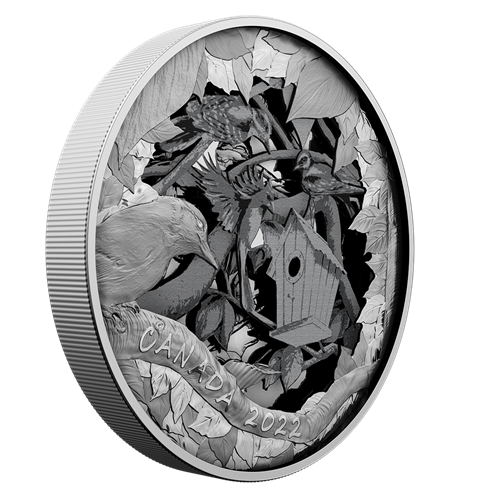 - Une première mondiale. La première pièce « boîte-cadre » au monde présente quatrecouches de gravure distinctes au revers. Pour mettre en valeur cette nouvelle technologie de monnayage, nous avons pris une scène familière (le motif Oiseaux du voisinage de 2019) et l’avons divisée en couches supérieure et inférieure gravées qui encadrent deux autres couches intermédiaires de découpes superposées.