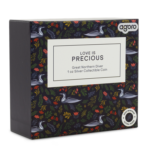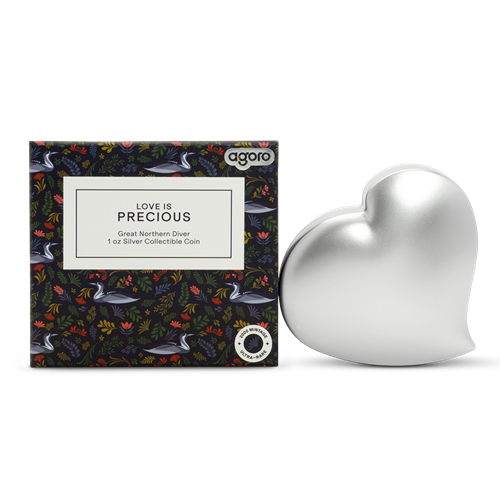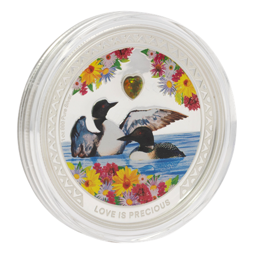 La nouvelle pièce Love is Precious – Huards est la 19ᵉ émission de cette série romantique. Frappée dans 1 oz d’argent pur, elle met en vedette deux huards, des oiseaux qui s’unissent pour la vie, entourés de fleurs aux couleurs vives symbolisant l’unité et la grâce.