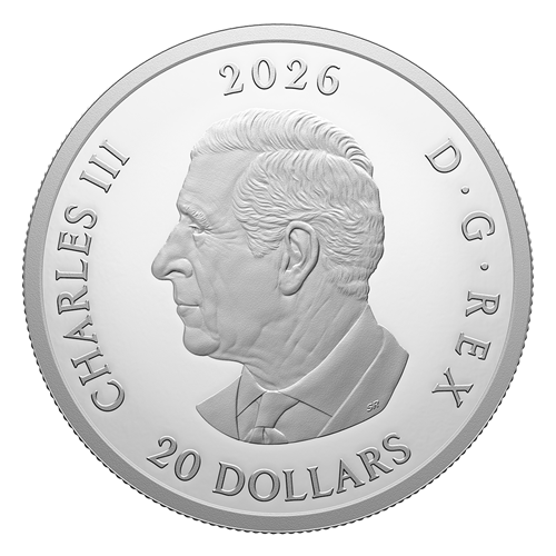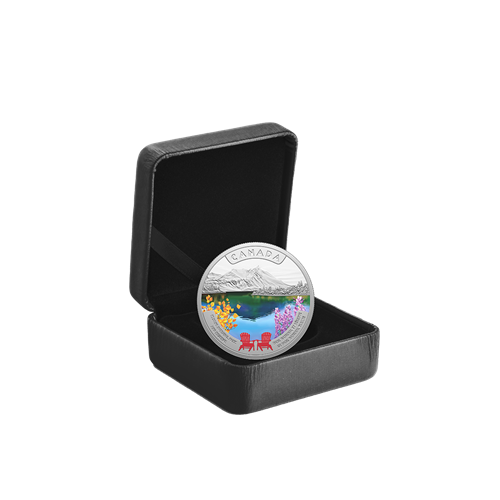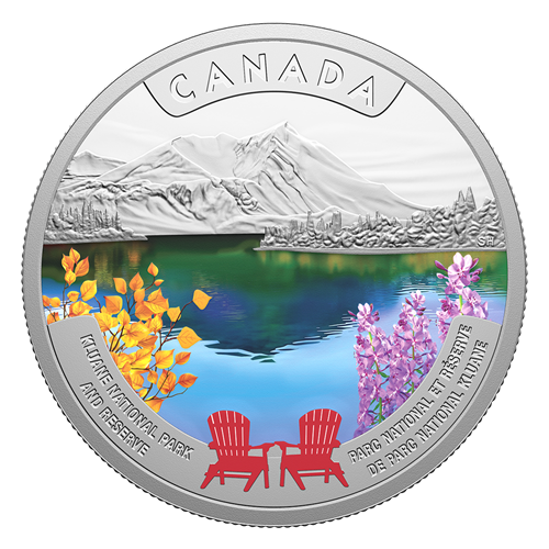 Le motif au revers, œuvre de l’artiste canadien Steve Hepburn, vous invite à vous asseoir et à profiter de la vue du parc national et réserve de parc national Kluane, situé dans le sud-ouest du Yukon. La vue des berges du Mät’àtäna Män (lac Kathleen) est encadrée par des branches colorées de peuplier de l’Ouest (Populus trichocarpa) et des fleurs d’épilobe à feuilles étroites (Epilobium angustifolium), tandis que la montagne gravée de King’s Throne se reflète sur la surface colorée de l’eau. Une coloration sélective rehausse également les deux chaises Adirondack rouges emblématiques des parcs nationaux du Canada. L’avers est à l’effigie de Sa Majesté le roi Charles III, selon l’artiste canadien Steven Rosati.